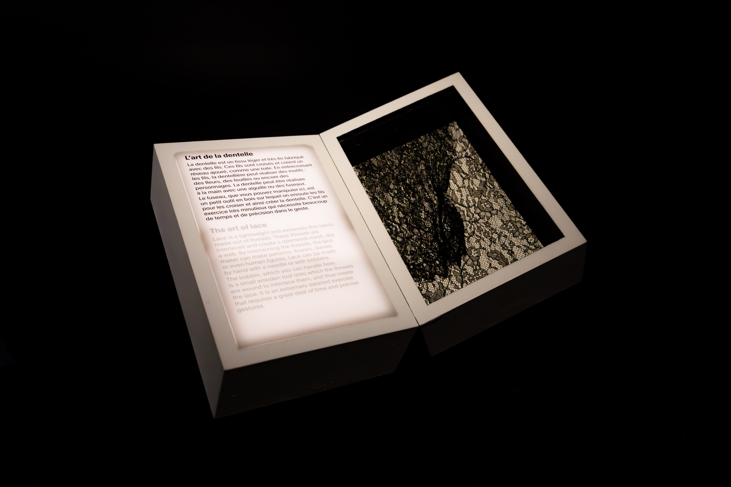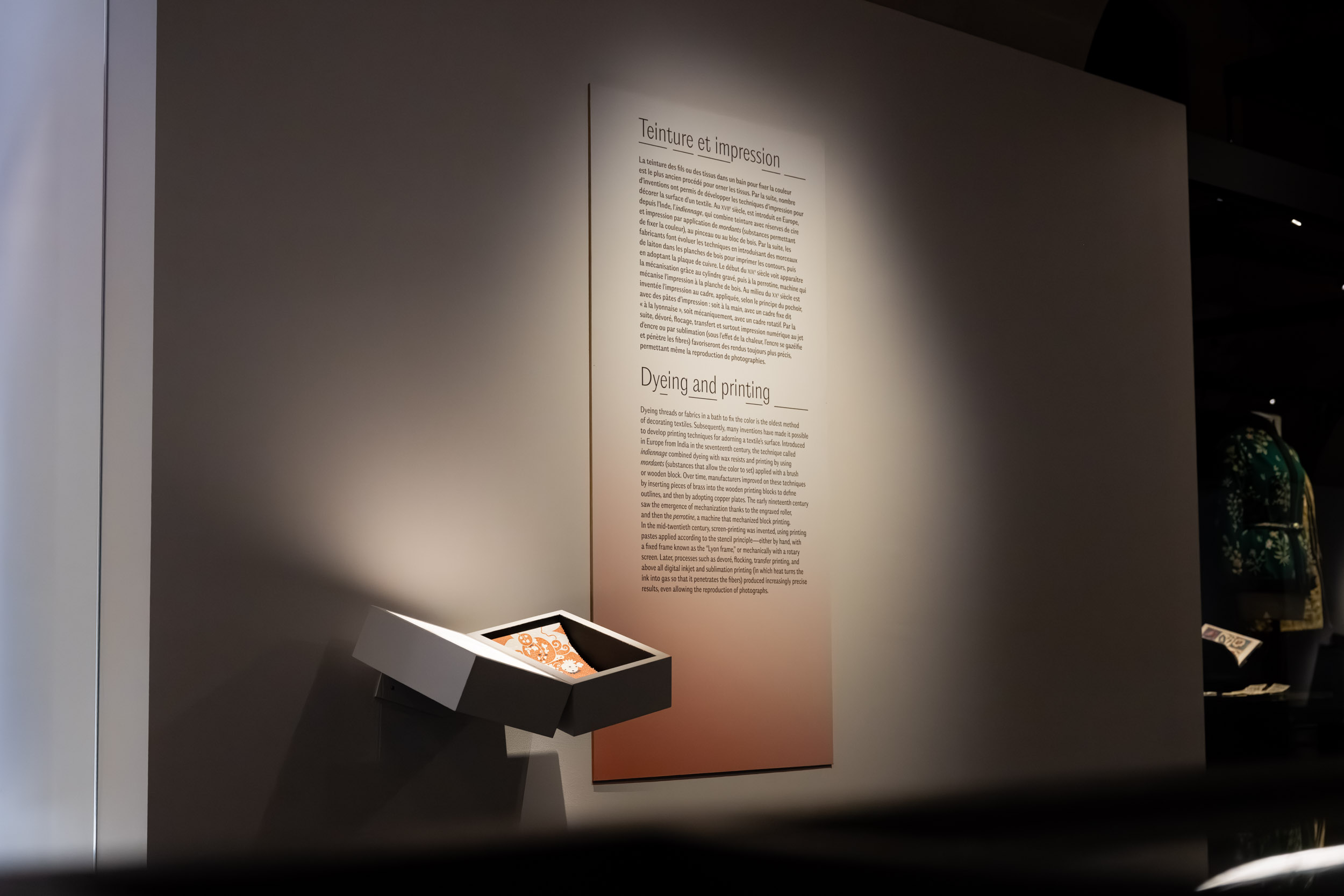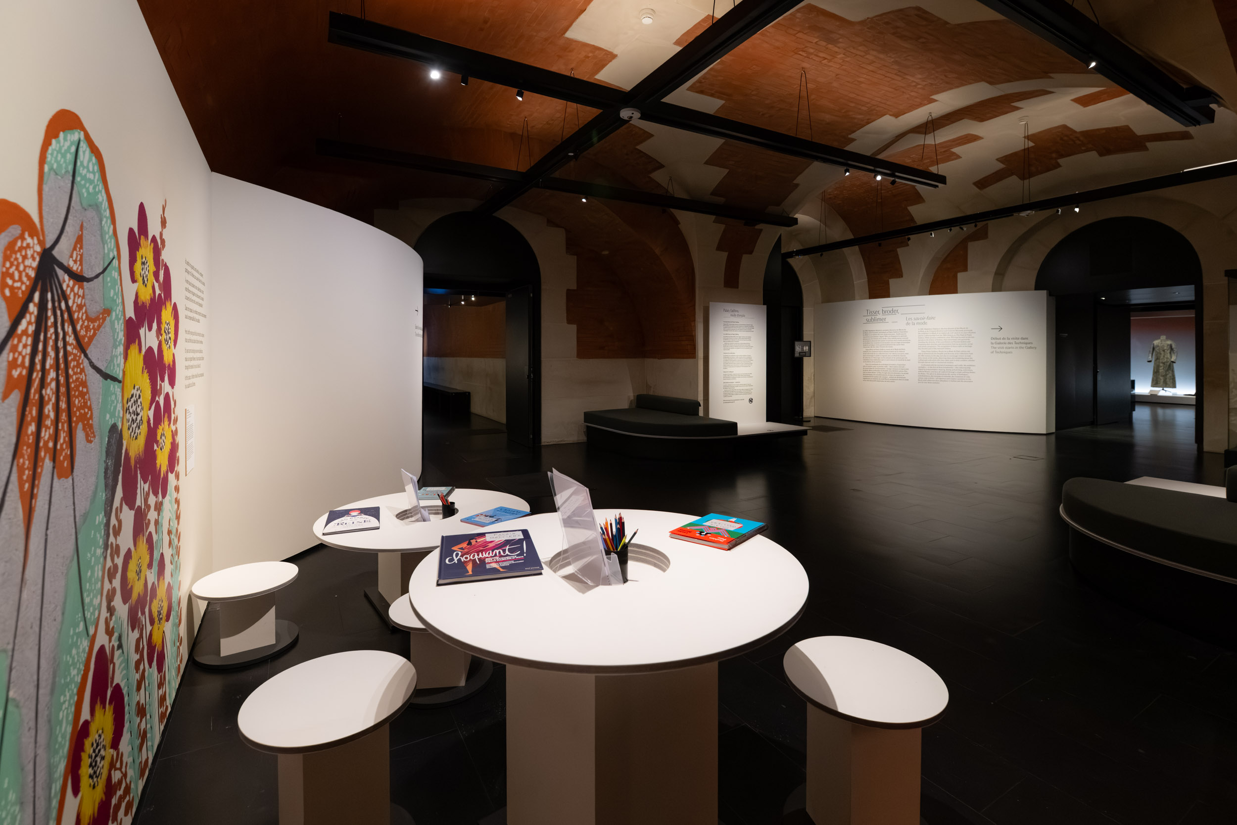 Réhabiliter l’exposition. L’exercice est ici poussé à son paroxysme avec un objectif de réemploi et de réadaptation à 95% ; cent serait chimérique. La connaissance des lieux et des montages d’expositions précédentes a permis de créer des ponts entre toutes les possibilités. Tout cela n’est pas (dé)montré ostensiblement au public, et c’est là que réside le lien avec le thème de l’exposition, le Savoir-Faire : Développer ce qui ne se voit pas sauf pour celui qui a déjà visité la Mode en Mouvement et qui aura cette impression de déjà-vu mélangé à un changement; changement net par la luminosité et les touches de couleurs ; déjà-vu par la conservation de la structure existante. Ainsi, tous les grands éléments de constructions sont conservés et adaptés, et de petits mobiliers sont récupérés de précédentes expositions. La réadaption ne peut se faire sans l’intelligence du groupe, les artisans de l’ombre qui œuvrent pour un travail précis et précieux. Au-delà, le point commun se poursuit dans la transmission : imaginer la suite. Permettre une vraie souplesse pour que l’exposition puisse vivre ses futures rotations sereinement, sans modifications majeures. Conserver, adapter, transmettre.
